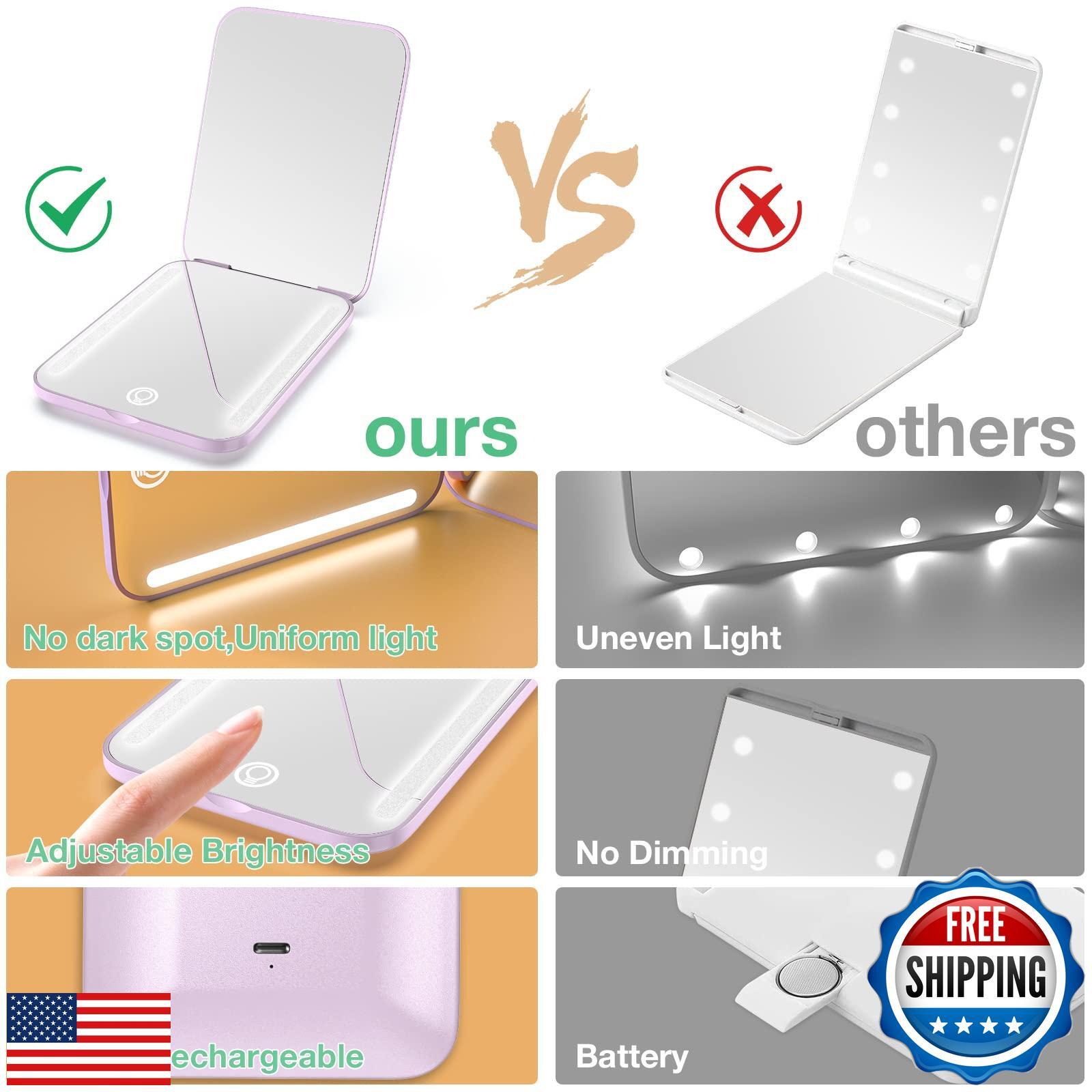 wobsion Travel Mirror with Light,1x/3x Compact Magnifying Mirror for Makeup,3 Color Modes,Portable Rechargeable Mini Mirror for Purse,Pocket,Gift,Purple Features LED Small Mirror:8 super bright LEDs, ensure lighting without glare,and long press can adjust the brightness to what you need3X Magnification Mirror:1X/3X magnification mirror is ideal for applying makeup, close up tweezingPortable:3.3 in*2.5 in,almost the same