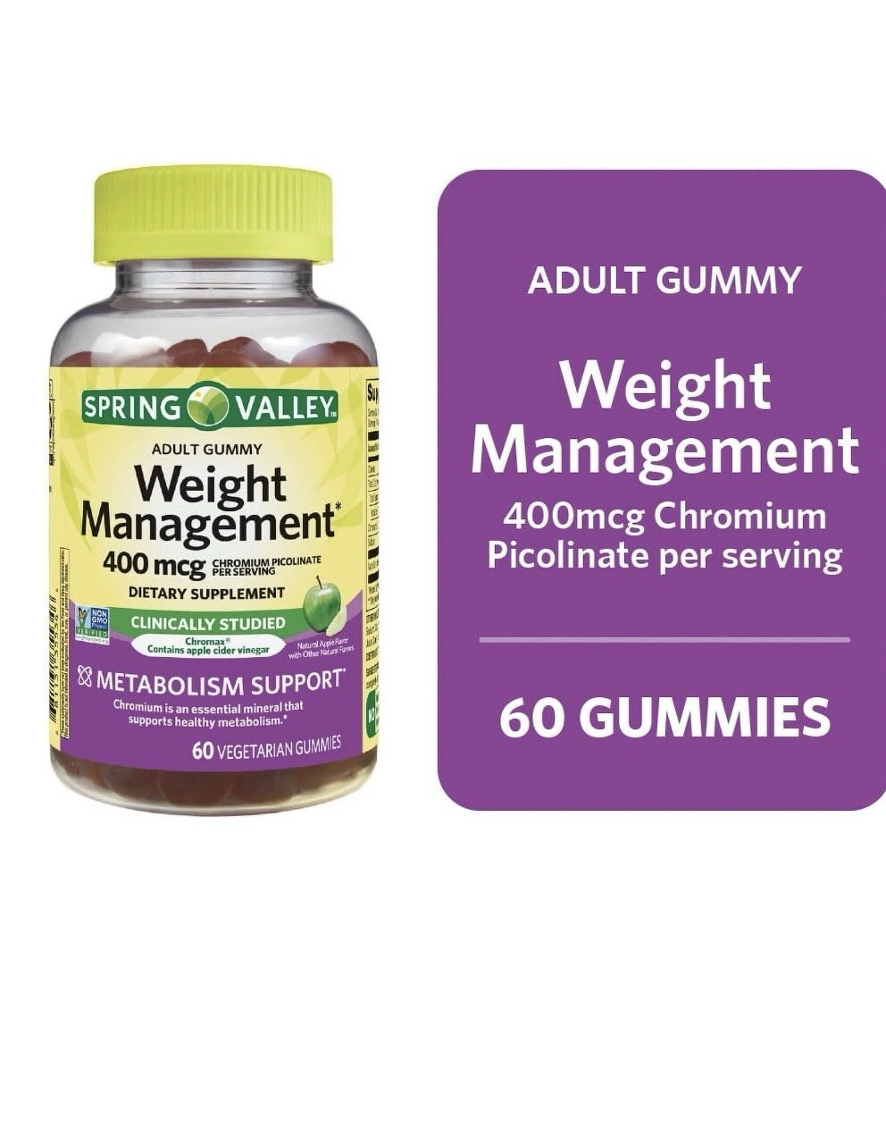 Spring Valley, Weight Management Dietary Supplement Gummies, 400 Mcg, 60 CountSpring Valley Non GMO Weight Management Dietary Supplement Gummies, Apple, Spring Valley Weight Management Vegetarian Gummies are the simplest, best-tasting way to support a healthy metabolism. Our delicious and easy to chew gummies make taking your daily weight management supplement a joy. Spring Valley understands living a healthy, balanced lifestyle is the key to being your best self. With a commitment to using only the highest quality ingredients, Spring Valley gummies are a simple and delicious addition to your daily routine that you can feel good about. Our affordable range of high-quality products supports you and your family's health and holistic wellbeing.
